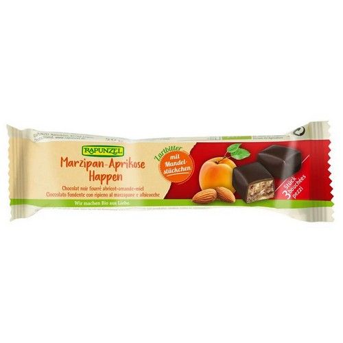 Zloženie: Medový marcipán * (30,00%) (MANDLE * (53,00%), med *), tmavá čokoláda * (25,00%) (trstinový cukor *, kakaová hmota *, kakaové maslo *), sušené marhule * (marhule *, ryžová múka) *), MANDLE * pražené (23,00%) (* – produkty z ekologického poľnohospodárstva)